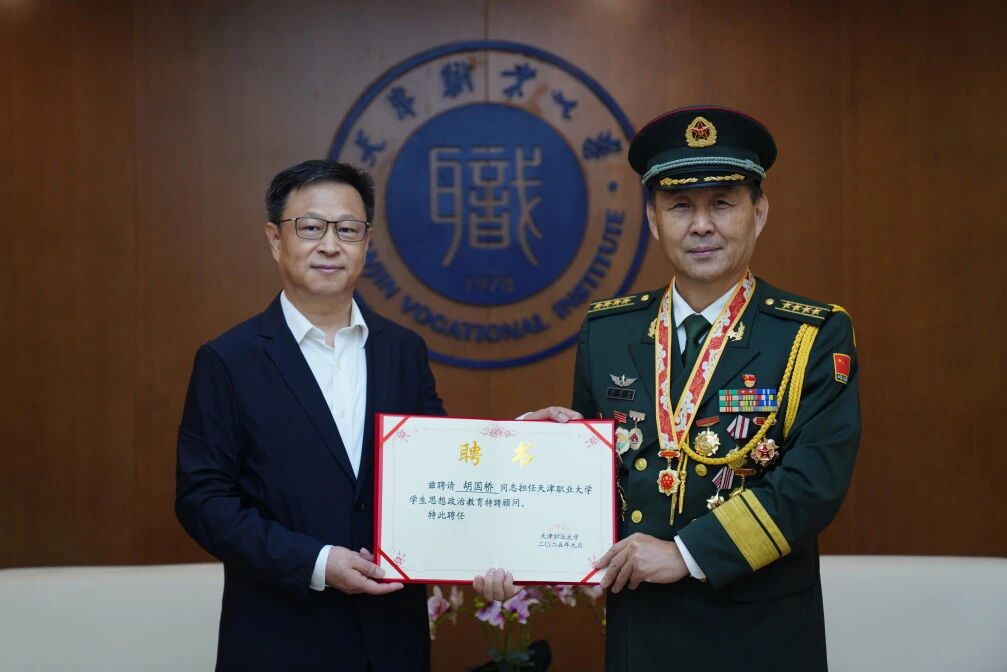 校党委书记夏静波热情接待了胡国桥大校一行,代表学校对胡国桥大校的到来表示热烈欢迎,并聘请胡国桥大校为“天津职业大学学生思想政治教育特聘顾问”。