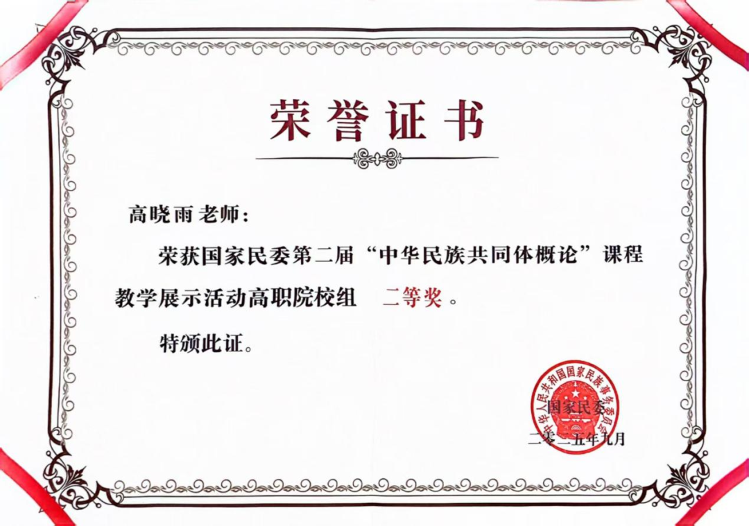 9月19日,由国家民委主办,教育部协办的第二届“中华民族共同体概论”课程教学展示活动在中南民族大学圆满落幕。我校马克思主义学院高晓雨老师经历层层选拔,在全国525所高校的767名教师中脱颖而出进入现场展示环节,荣获高职组二等奖第一名。