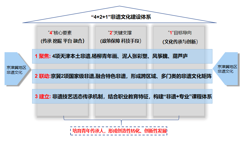 该项目由我校艺术工程学院组织建设,以京津冀地区底蕴深厚的非遗资源为核心,以职业教育为依托,构建“4+2+1”非遗文化建设体系,打造了集传承、教育、创新、传播于一体的非遗校园文化建设模式。创新构建“政府政策引导、学校主导实施、企业技术市场支撑、大师工作室技艺赋能”四方联动机制,为非遗的活态传承与创新转化提供了系统保障;实践“五融四进”系统育人法,将非遗从“一门课”或“一次活动”提升为贯穿人才培养全过程的“文化育人体系”;推动数字技术赋能传承,建设非遗数据库、开发MR交互项目,将传统技艺转化为可存储、可再现、可交互的数字资产;探索“文创驱动”转化路径,以文创产品开发作为连接非遗传统与当代生活、连接课堂教学与市场需求的关键纽带;通过校企合作、师生共创,将非遗元素转化为具有实用价值与审美价值的文创产品,实现了文化价值向经济价值与社会价值的有效转化。